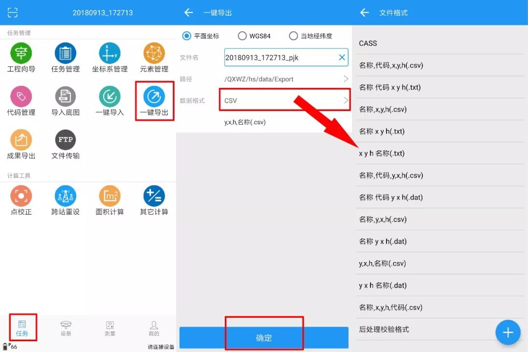 选择主界面【任务】→【一键导出】→设置导出数据格式及保存路径→【确定】