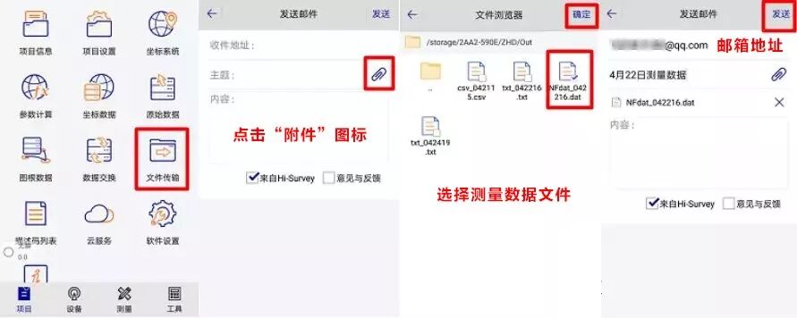 主界面【项目】→【文件传输】→【输入收件地址】→点击附件图标→【选择测量数据文件】并确定→点击【发送】