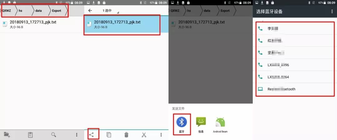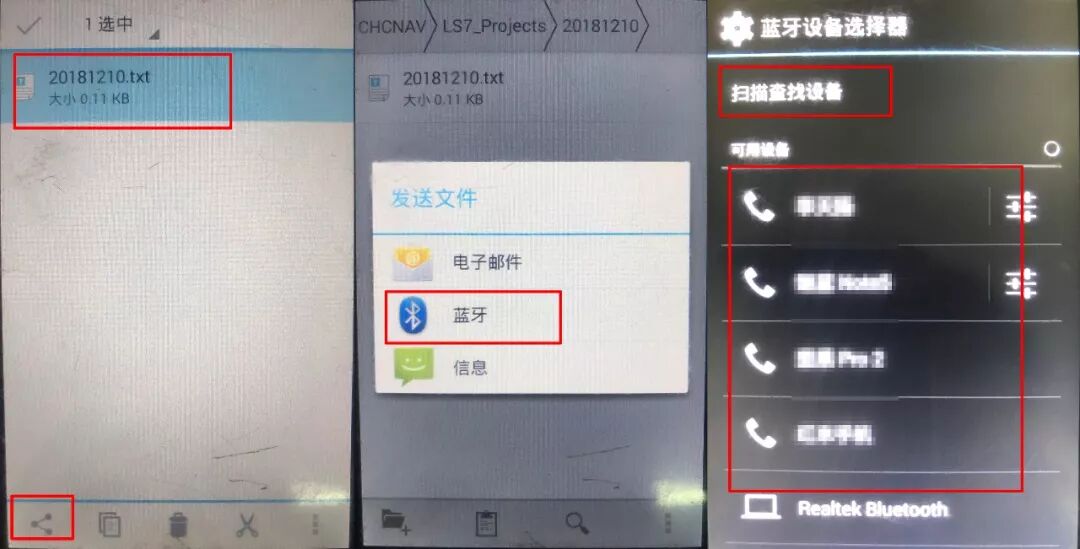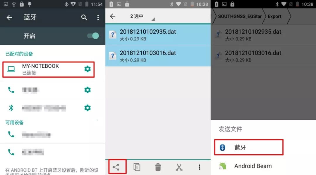 打开手簿蓝牙→搜索设备→连接电脑蓝牙→选择手簿测量数据文件→右下角分享图标→选择蓝牙发送文件→选择电脑蓝牙