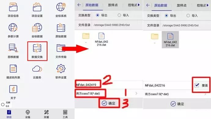 主页面【项目】→【数据交换】→勾选【导出】→输入文件名并选择文件格式→点击【确定】,根据情况,可勾选覆盖选项。