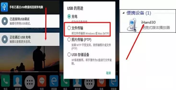 将电脑与手簿用USB数据线 / 充电线连接,下拉手簿屏幕顶部菜单,点击【正通过USB充电】,选择文件传输即可,然后“我的电脑”上会显示iHand30,点击进入iHand30选择内部存储中的ZHD/OUT,进入Hi-survey数据导入导出默认路径,将导入文件拷贝至电脑桌面或其它路径。