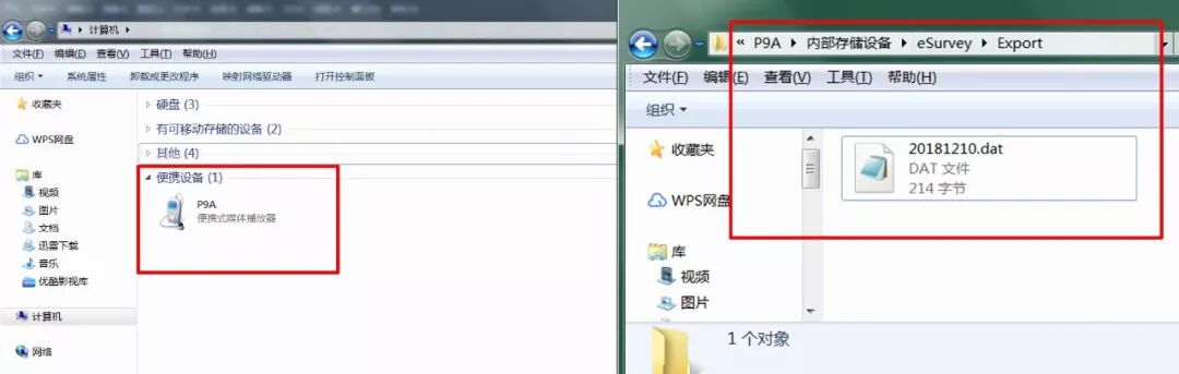 将手簿接入电脑即可,然后在电脑上打开【我的电脑】→【便携设备丨P9A】→【内部存储设备】→【eSurvey】→【Export】选择导出的数据文件进行拷贝