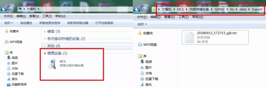 然后在电脑上打开【我的电脑】→【便携设备HC1】,找到数据文件存放路径,千寻星矩数据默认存放路径【QXWZ】→【hs】→【data】→【Export】