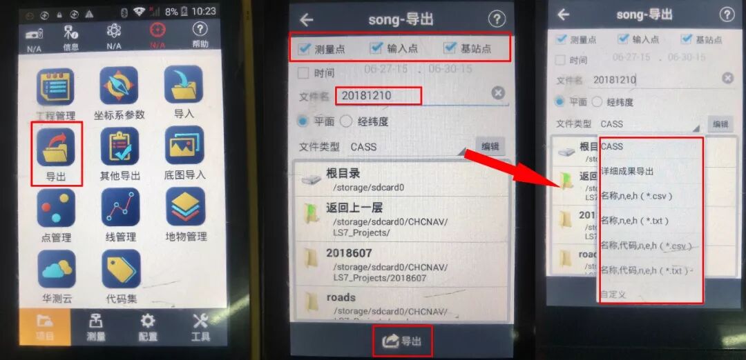 步骤同上,与南方H5手簿蓝牙传输步骤一样,华测导出数据默认保存在手簿主页面【文件管理】→【手机存储】→【CHCNAV】→【LS7_Projects】