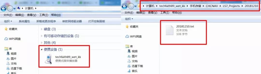 将手簿接入电脑即可,然后在电脑上打开【我的电脑】→【便携设备丨techfaith89_wet_kk】→【手机存储】→【CHCNAV】→【LS7_Projects】选择导出的数据文件并进行拷贝
